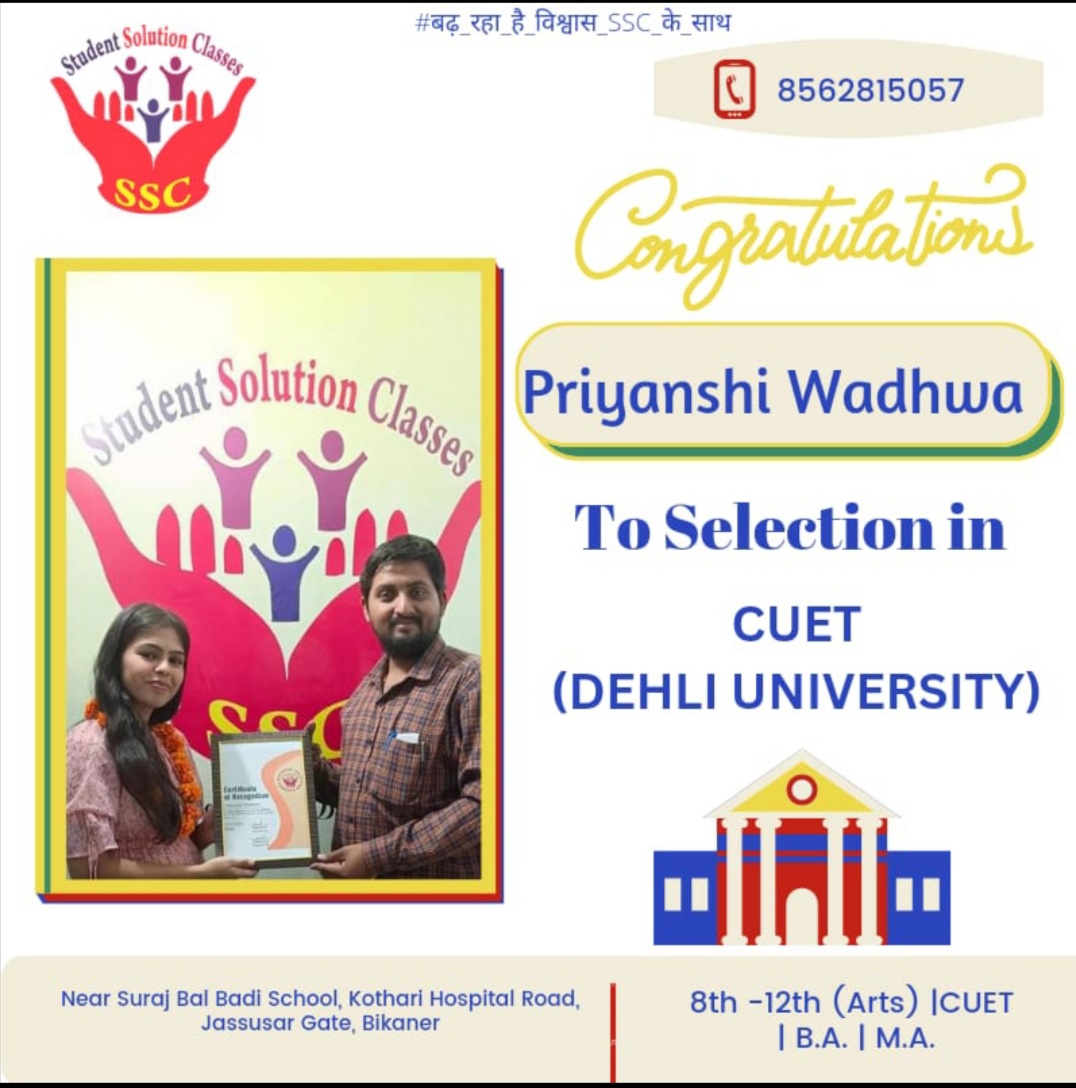 बीकानेर। शहरी परकोटे में सर्वाधिक सलेक्शन देने वाली इंस्टीट्यूट स्टूडेंट सॉल्यूशन क्लासेज की छात्रा प्रियांशी वाधवा का चयन केंद्रीय विश्वविद्यालय प्रवेश परीक्षा(CUET) के द्वारा दिल्ली विश्वविद्यालय के श्यामा प्रसाद मुखर्जी महाविद्यालय(नार्थ कैम्पस) में हुआ है। प्रियांशी का चयन CUET के आधार पर हुआ है। प्रियांशी ने CUET की तैयारी SSC के CUET बैच से की थी। प्रियांशी ने अपनी सफलता का श्रेय SSC को दिया। प्रियांशी ने बताया कि SSC के शिक्षकों द्वारा समय-समय पर दिए दिशानिर्देश उसके लिए लाभकारी सिद्ध हुए। इस शुभ अवसर पर SSC निदेशक आनंद सर ने प्रियांशी का माला व स्मृति चिह्न भेंट कर हौसला अफजाई की। पीयूष सर ने बताया कि संस्था द्वारा फिलहाल 8 वीं से 12वीं कला व वाणिज्य दोनों संकाय में क्लासेज चल रही है। कार्यक्रम में रवि सर, मारुति सर, भरत सर तथा प्रवीण सर आदि उपस्थित थे।