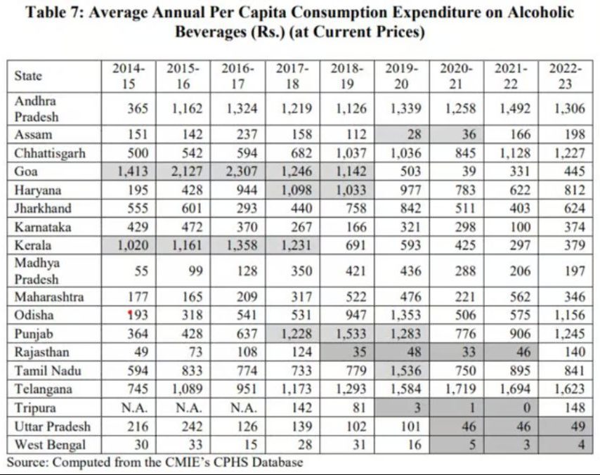 वित्त मंत्रालय के नेशनल इंस्टिट्यूट ऑफ पब्लिक फाइनेंस एंड पॉलिसी (NIPFP) के अध्ययन के अनुसार, आंध्र प्रदेश और तेलंगाना में शराब पर प्रति व्यक्ति औसत वार्षिक उपभोग खर्च देश भर में सबसे अधिक है। NSSO के 2011-12 के सर्वे में आंध्र प्रदेश के लोग शराब पर सबसे अधिक खर्च करते हैं, यहां शराब पर प्रति व्यक्ति औसत वार्षिक उपभोग व्यय 620 रुपये है, वहीं सीएमआईई के कंस्यूमर पिरामिड्स हाउसहोल्ड सर्वे के अनुसार, तेलंगाना में सबसे अधिक औसत वार्षिक प्रति व्यक्ति उपभोग व्यय 1,623 रुपये (2022-23 के लिए वर्तमान मूल्य) है।